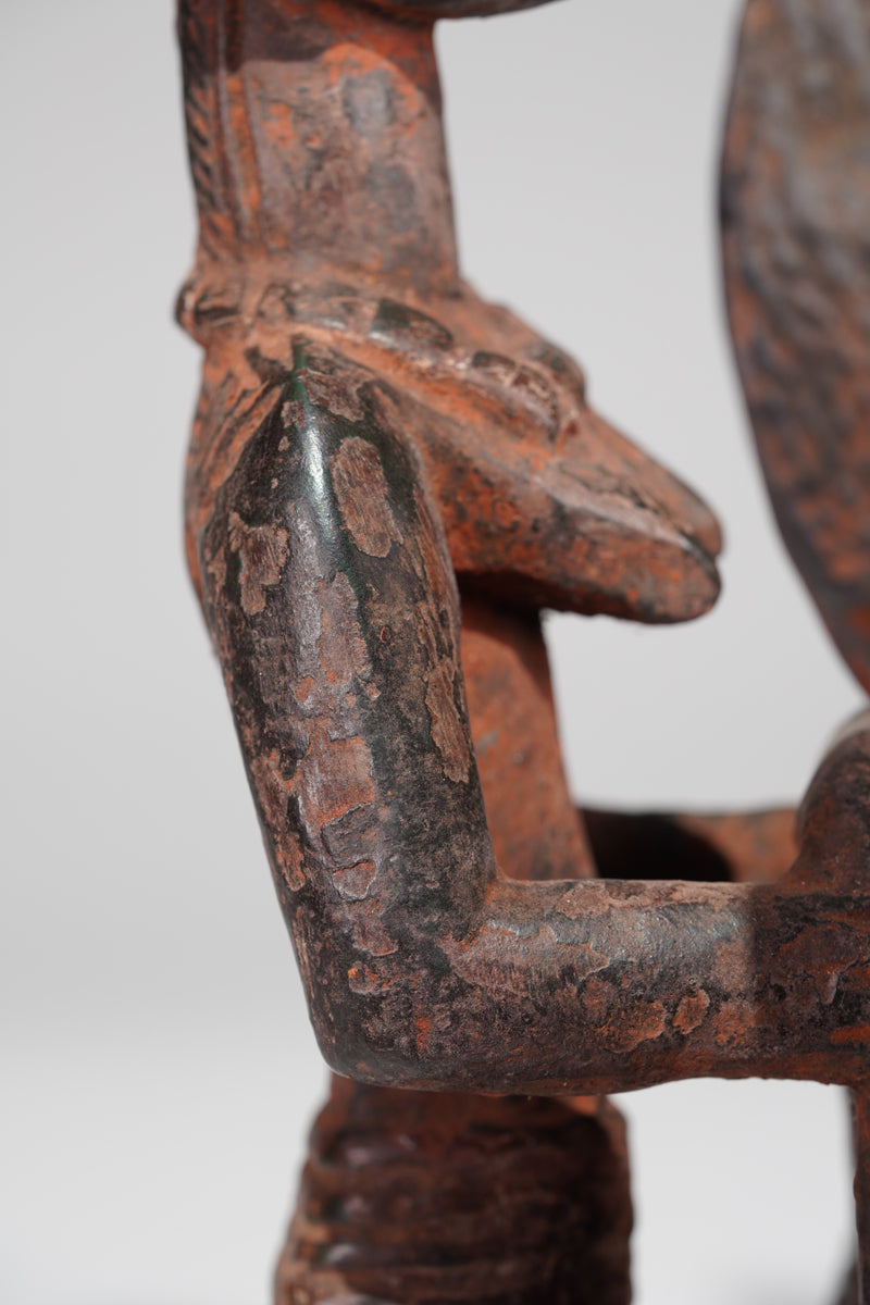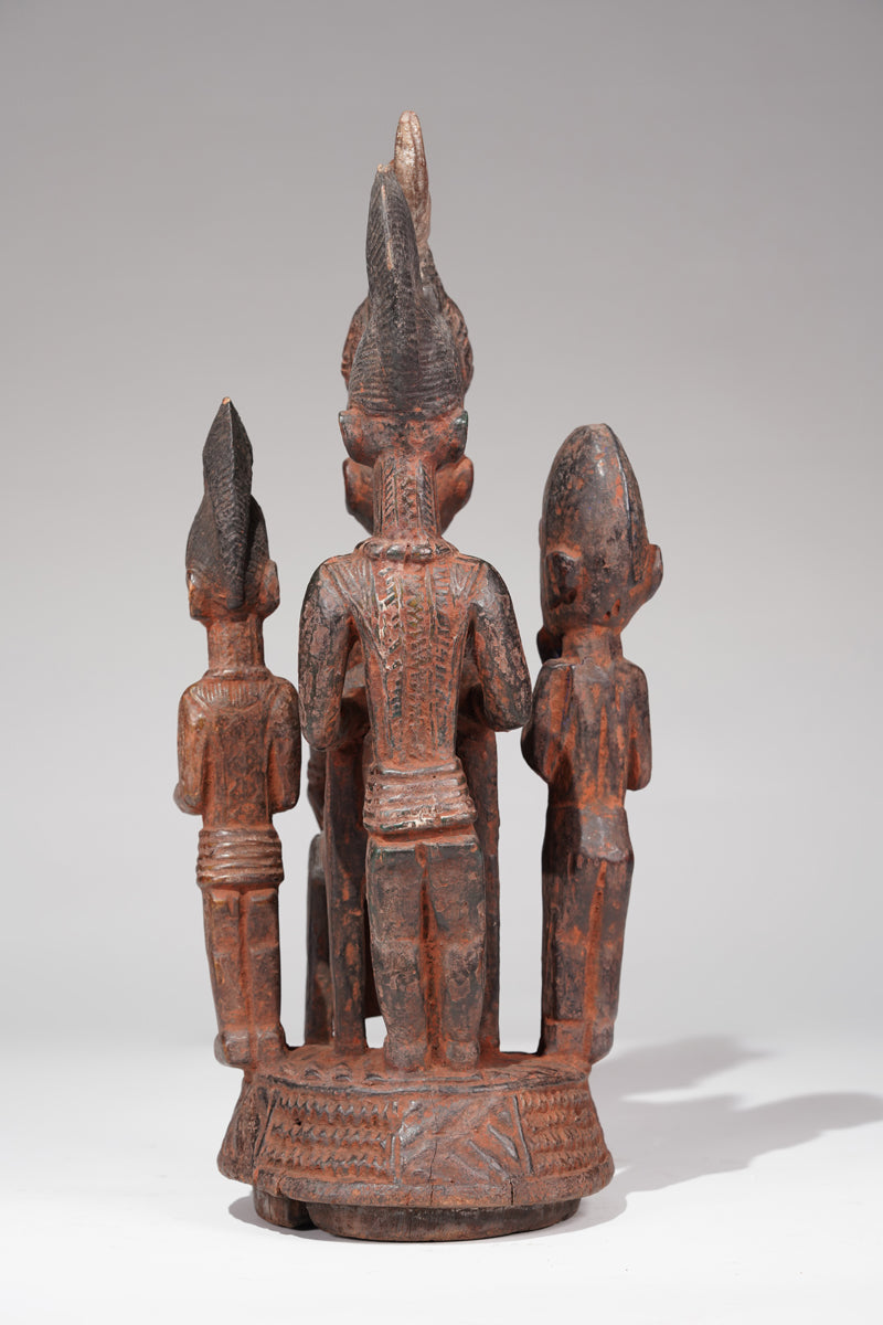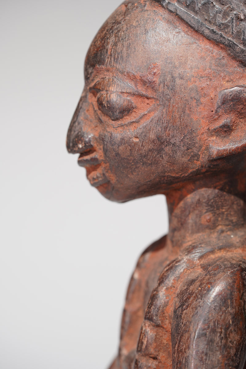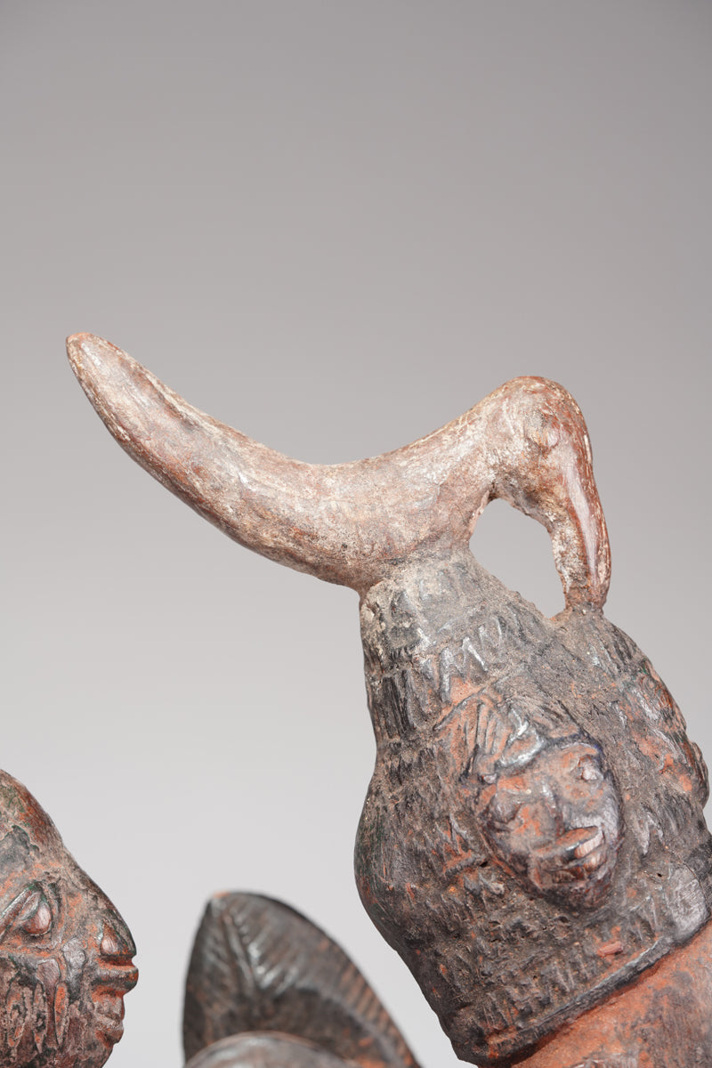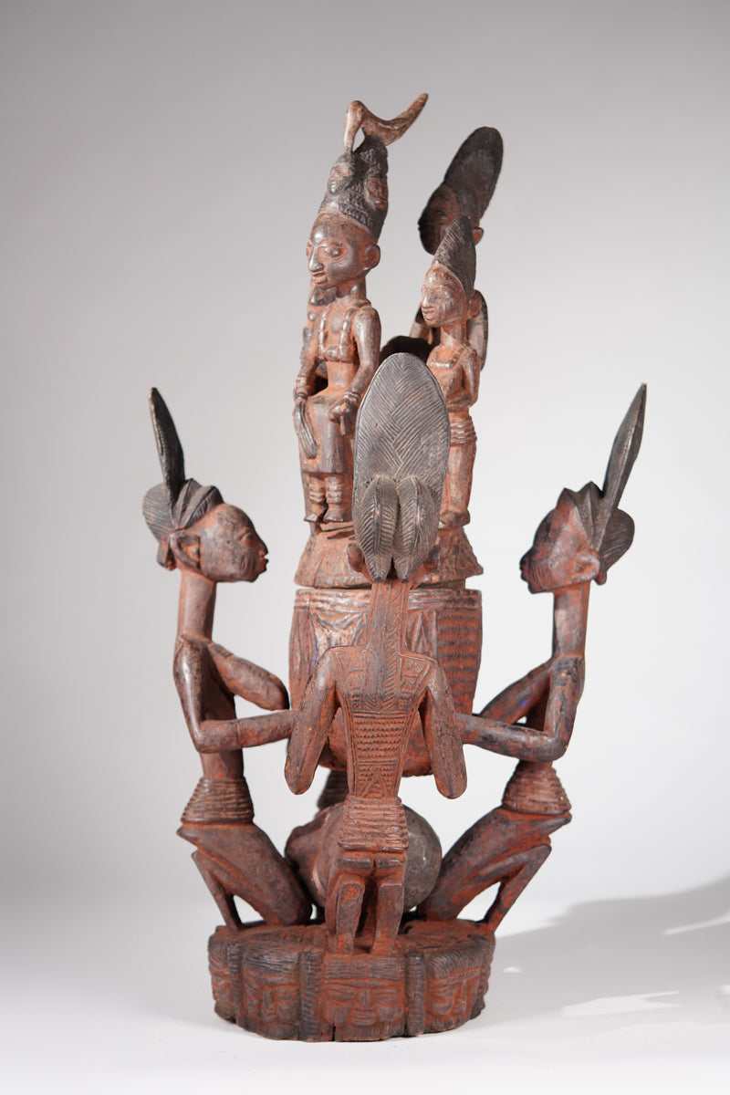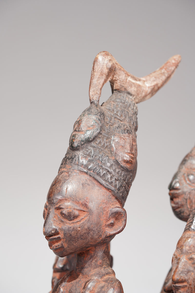 Two of Olowe’s most famous sculptures are similar in depicting a kneeling female figure holding a bowl, which is supported by smaller kneeling or standing figures from below and with additional figures on the lid. In one instance, the figures are four dancing women. On the other, two cocks face one another. Beneath the bowl and held within its own space is a man’s head that freely rolls about. One of the bowls is in the Walt Disney-Tishman African Art Collection; the other is in the collection of the National Museum of African Art. Now there is a third, slightly smaller in scale but equally brilliant in its complexity of composition and excellence of condition. Two of Olowe’s most famous sculptures are similar in depicting a kneeling female figure holding a bowl, which is supported by smaller kneeling or standing figures from below and with additional figures on the lid. In one instance, the figures are four dancing women. On the other, two cocks face one another. Beneath the bowl and held within its own space is a man’s head that freely rolls about. One of the bowls is in the Walt Disney-Tishman African Art Collection; the other is in the collection of the National Museum of African Art. Now there is a third, slightly smaller in scale but equally brilliant in its complexity of composition and excellence of condition.