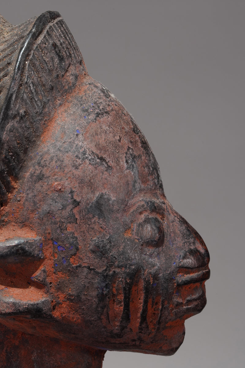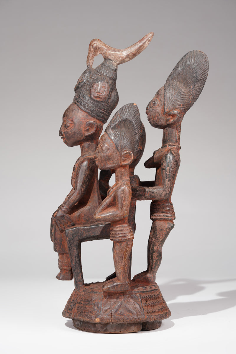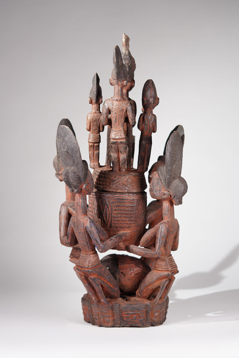 Two of Olowe’s most famous sculptures are similar in depicting a kneeling female figure holding a bowl, which is supported by smaller kneeling or standing figures from below and with additional figures on the lid. In one instance, the figures are four dancing women. On the other, two cocks face one another. Beneath the bowl and held within its own space is a man’s head that freely rolls about. One of the bowls is in the Walt Disney-Tishman African Art Collection; the other is in the collection of the National Museum of African Art. Now there is a third, slightly smaller in scale but equally brilliant in its complexity of composition and excellence of condition.