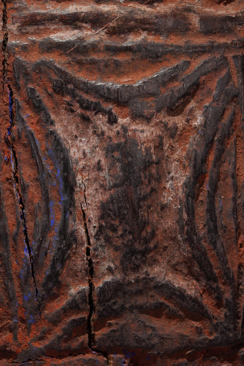 Olowe’s genius as an artist was threefold. He was skilled in the use of his tools, ifarabale, a master of composition, oju-ona, and addressed his subject matter with extraordinary insight, oju-inu. The large bowl, with its elaborately decorated surface, is beautifully balanced by the slender, kneeling female figure whose long neck and soaring coiffure carries the viewer’s eye away from the bowl. And yet, her face concentrates on the bowl, since she too is a container of power. The smaller figures below the massive bowl lift it with apparent ease, their bodies leaning out into the surrounding space, the hand of one reaching up to hold onto the mother’s arm, for they are the children of her offering. Viewed from the mother’s back, which is skillfully incised and painted, strengthening the vertical line in relationship to the sphere of the bowl, one observes that her body leans a bit to the right. However, Olowe places her right hand a bit lower than the left hand on the bowl, thus catching its weight and thereby adding a graceful touch of motion to the composition.