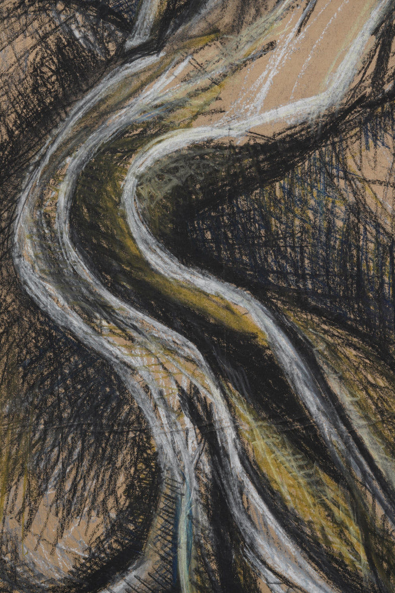 Irena Klonek's mastery of chalk and charcoal on brown paper shines through in this still life study, inviting viewers to appreciate the artistry in the details of the saddle, stirrup, and flaps, as well as the nuanced play of light and shadow in this evocative sketch.
