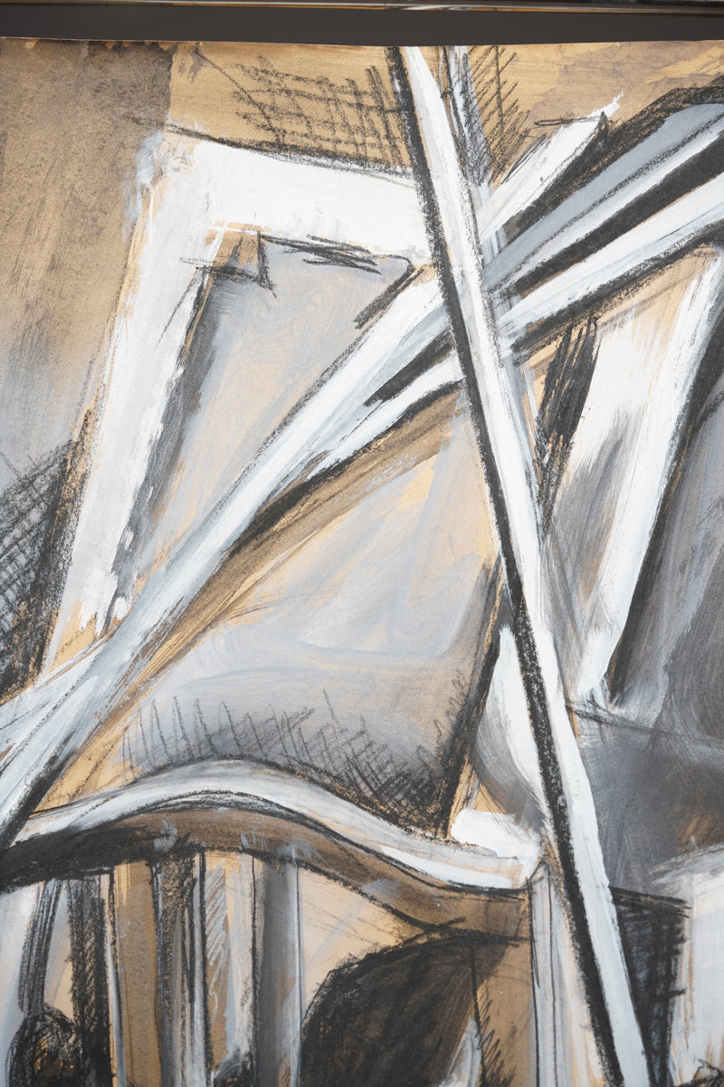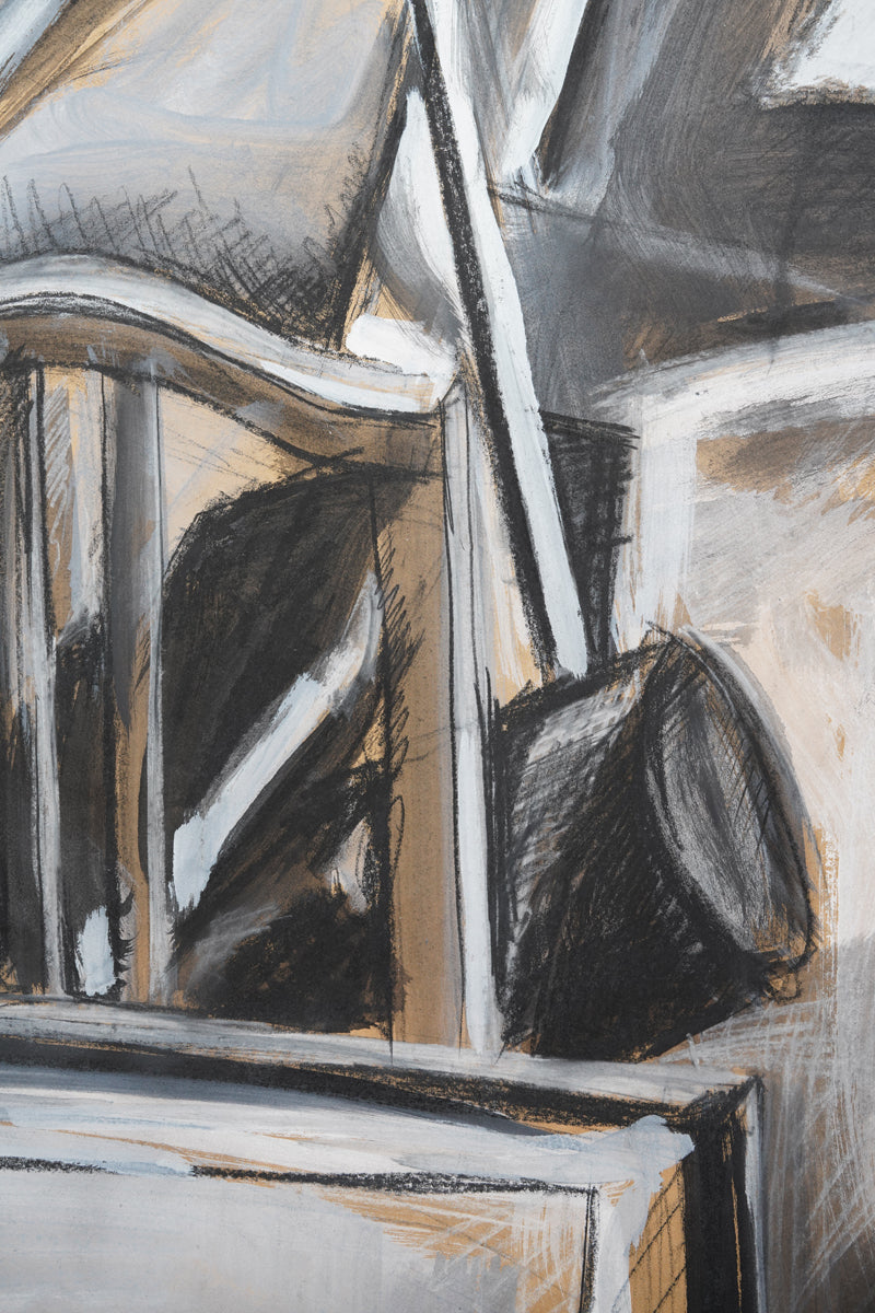 A compelling still life sketch by Irena Klonek, rendered in chalk and gouache on brown paper, featuring an abstract arrangement of objects—an interplay of two chairs, numerous wooden bars, long swaths of fabric, and canvases, all harmonized in subtle colours of whites, blacks and greys. Klonek's distinctive style is evident in the bold use of heavy, thick lines, defining the shapes and forms of the objects in the scene.