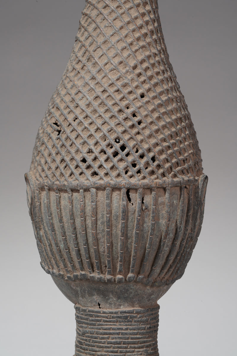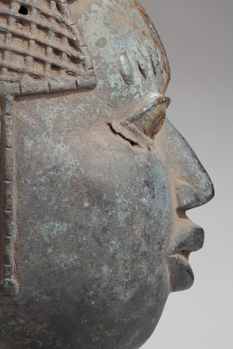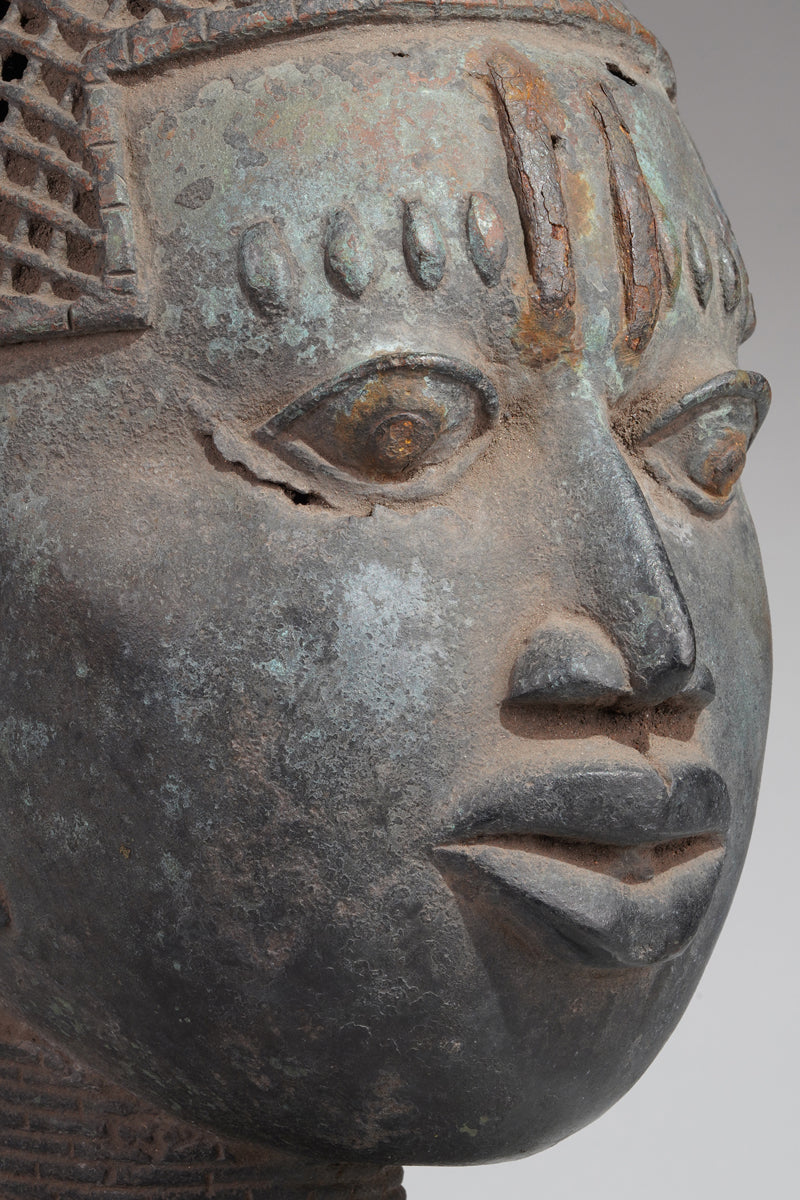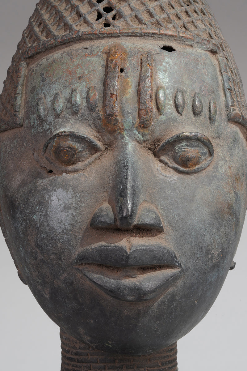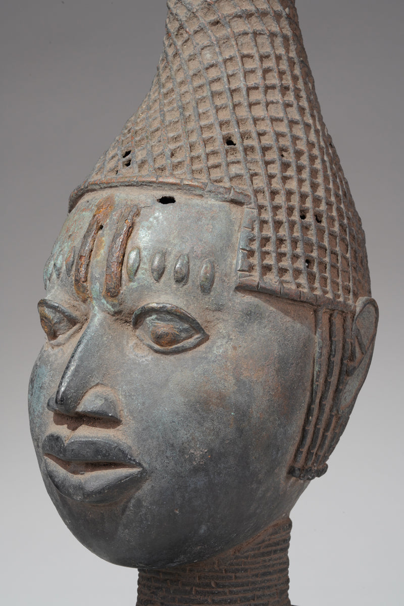 It is a very realistic representation of a young woman from the Benin court, who wears a high pointed ukpe-okhue crown of lattice-shaped red coral beads. The eyes and two bands between them are inset with iron. Above each eyebrow are engraved four cicatrices. The sophisticated technique and design of the four heads suggest that they were made in the early sixteenth century, when Queen Idia, mother of Oba Esigie, ruled the Benin court." Source: revolvy.com