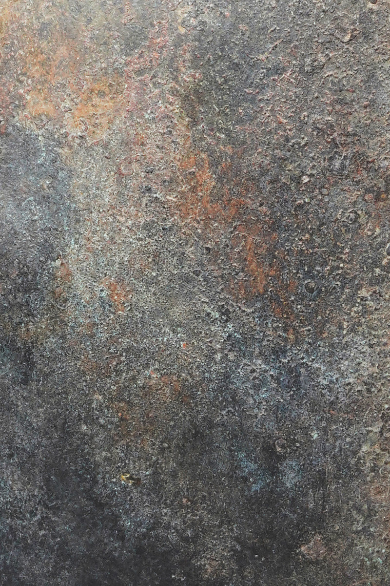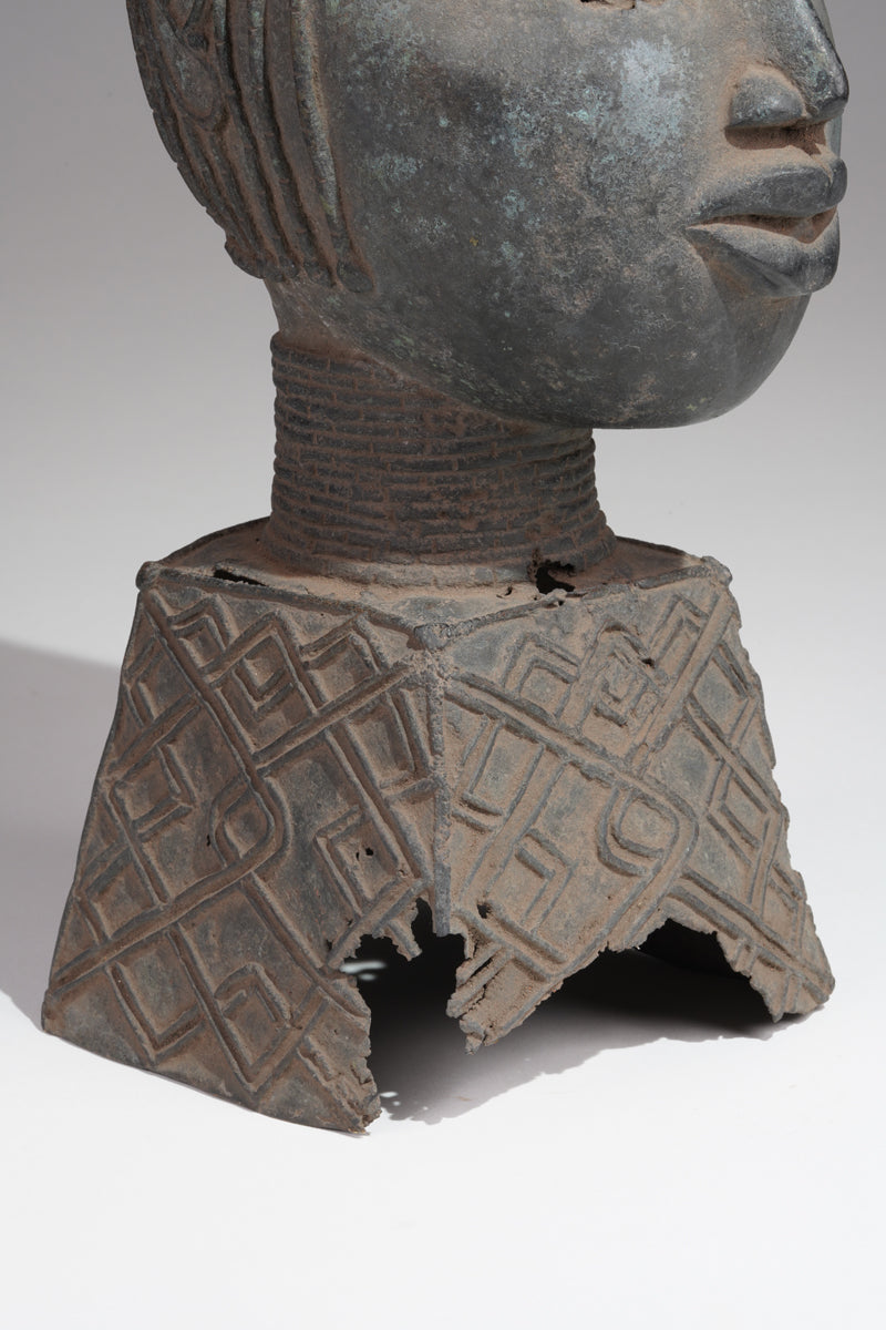 This bronze sculpture depicts probably of the Idia Queen of the Benin Kingdom, today Nigeria, it´s based on a fragmentary trapezoid plinth, the even face is relatively well preserved and shows only minor corrosion damage, the iron inlays on the forehead and in the eyes are still preserved, the greenish patina shows several layers of oxidations, several small damages on the perlhood, but in general a beautiful, rare bronze.