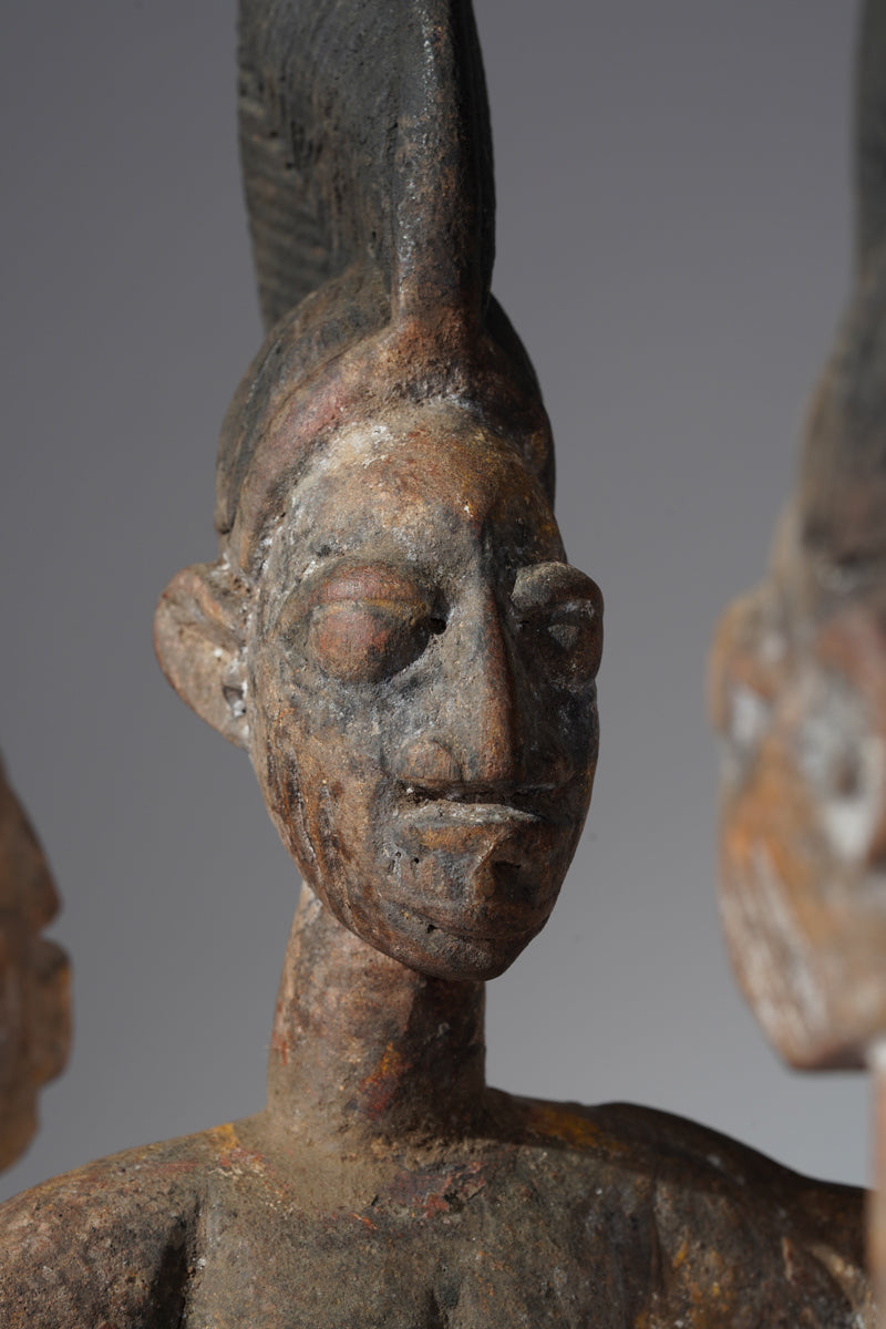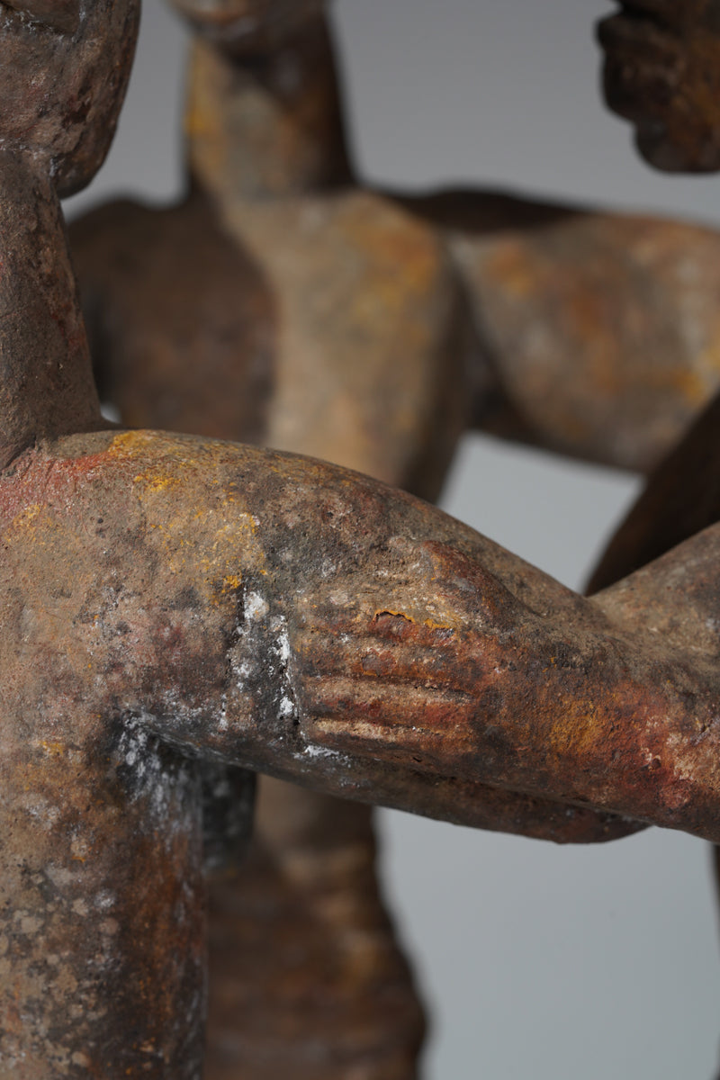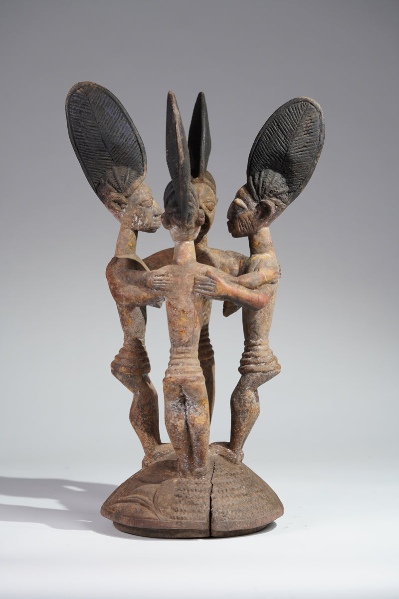 Yoruba bowl lid collected in Ekiti region, Nigeria, of four female figures on a pedestal clasping each others arms in a circle. The base has a crack, sand some significant signs of ritual use and age.